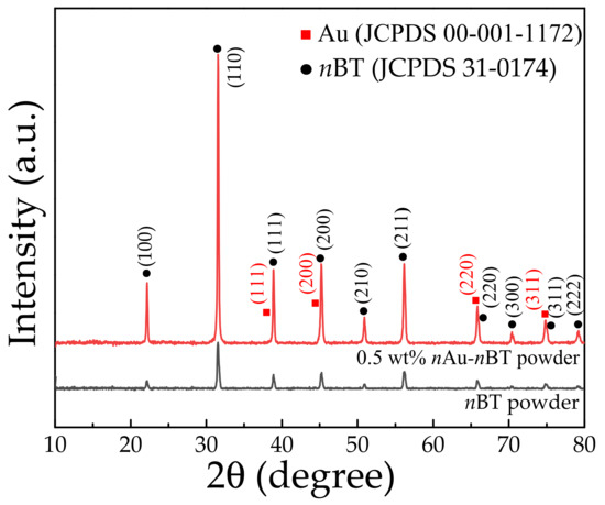 XRD patterns of nBT powder and nAu-nBT hybrid powder.