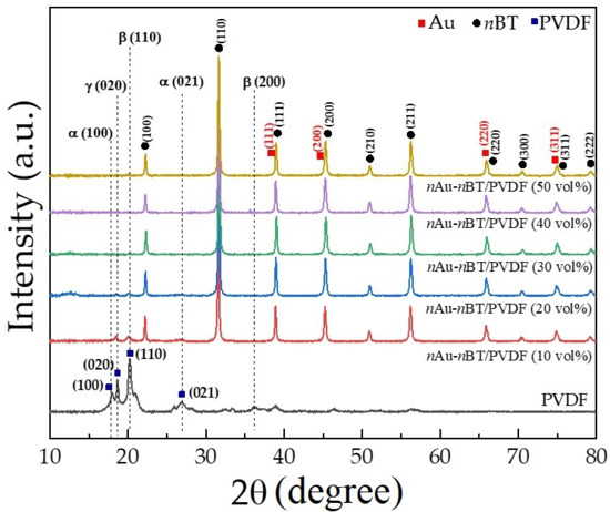 To confirm the phase compositions, the pure PVDF polymer and nAu-nBT/PVDF nanocomposites with various contents of nAu-nBT hybrid (10–50 vol%) were characterized using the XRD technique. As indicated in Figure 5, the non-polar α-phase and the polar β- and γ-phases were detected in the XRD pattern of the PVDF polymer. The diffraction peaks at 2θ ≈ 18°and 26.7° can be assigned as the α-phase, corresponding to the (100) and (021) planes, respectively. The β-phase peak was indexed at 2θ ≈ 20.4° and 36.6°, corresponding to the (110) and (200) planes, respectively. The γ-phase peak was detected at 2θ ≈ 18.6°, corresponding to the (020) plane [3,40,41,42]. For the nAu-nBT/PVDF nanocomposites with low fnAu-nBT, the intensity of these PVDF-phases was very low due to the high crystallinity of the filler. Furthermore, all PVDF-phases cannot be observed in the nAu-nBT/PVDF nanocomposites with high fnAu-nBT. The phases of a PVDF polymer in the composites can be formed in several phases, depending on to preparation method and types of fillers [2,3].