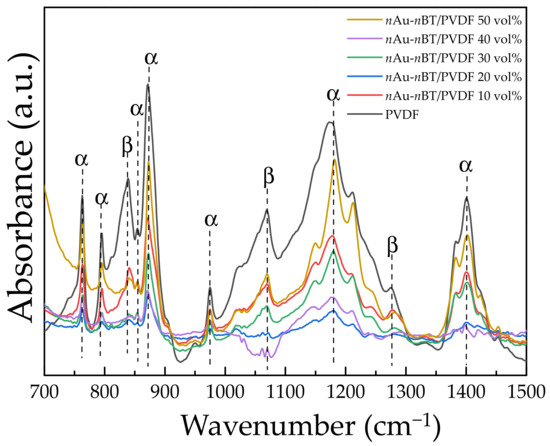 The nAu-nBT/PVDF nanocomposites were further characterized using the FTIR technique to identify the phases of the PVDF polymer matrix. Figure 6 shows the FTIR spectra of the PVDF and nAu-nBT/PVDF nanocomposites. The FTIR peaks for the α-phase were observed at the wavenumbers of 766, 791, 873, 1179, and 1401 cm−1 [40,41]. The peak at 840, 1072, and 1275 cm−1 confirmed the presence of the β-phase of PVDF polymers [41]. It is worth noting that the characteristic peaks of the β- and γ-phases around 840–841 cm−1 were very close. The absorption values at 766 (Aα) and 840 cm−1 (Aβ) for the α and β phases, respectively, were used to calculate the β-phase content (F(β)) [41], as the following equation.