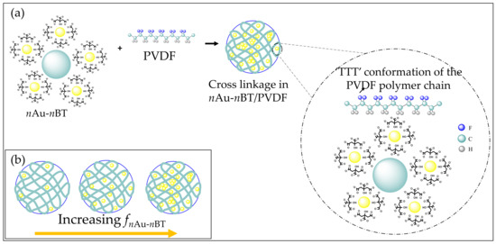 (a) Interaction between –CH2 dipole of PVDF polymer and negatively surface charge of nAu-nBT hybrid particles. (b) Schematic of loading of different concentrations of nAu-nBT filler into PVDF polymer chain with an increasing vol% of nAu-nBT.