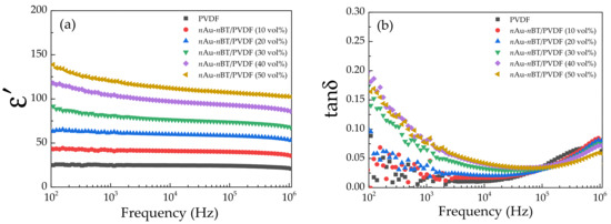 (a) Dielectric permittivity (ε′) and (b) dielectric loss tangent (tanδ) at 25 °C (102–106 Hz) of PVDF and nAu-nBT/PVDF nanocomposites with different contents of nAu-nBT.