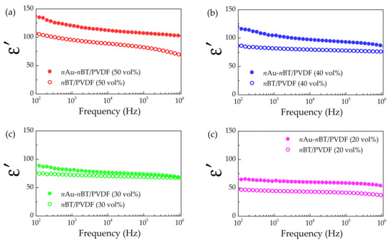 Comparison of dielectric permittivity (ε′) at 25 °C of nBT/PVDF and nAu-nBT/PVDF nanocomposites with different volume fractions: (a) 0.5, (b) 0.4, (c) 0.3, and (d) 0.2.