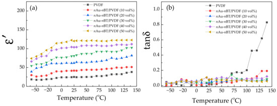 (a) Dielectric permittivity (ε′) and (b) dielectric loss tangent (tanδ) at 103 Hz (−60–140 °C) of PVDF and nAu-nBT/PVDF nanocomposites with different contents of nAu-nBT.