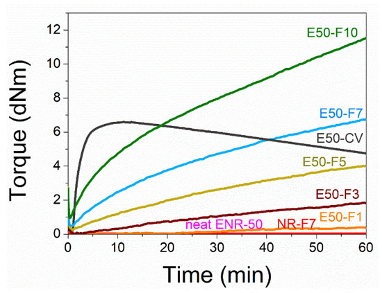 Mixing torque-time curves of ENR-50 compounds with various concentrations of FeCl3 at 1, 3, 5, 7 and 10 mmol (i.e., E50-F1, E50-F3, E50-F5, E50-F7 and E50-F10, respectively), and the conventional sulfur vulcanization (i.e., E50-CV), neat ENR-50, and unmodified NR (ADS) with 7 mmol of FeCl3 (NR-F7).