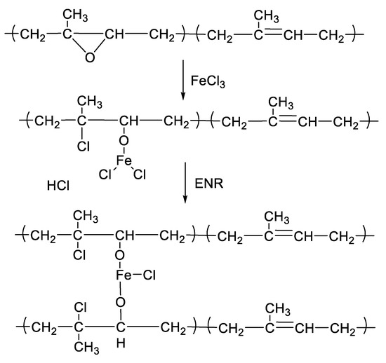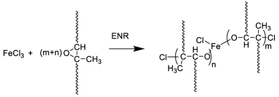 A proposed reaction mechanism between epoxidized natural rubber and ferric chloride. In the mechanism, the ring opening type polymerization of the epoxy group is described, which can be correlated with “internal polymerization” of the epoxy group of epoxide natural rubber.