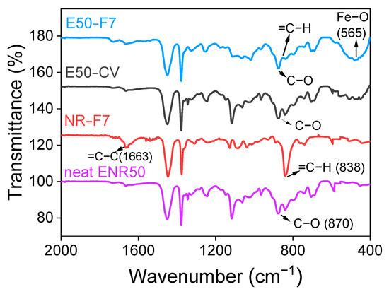 ATR-FTIR spectrum of the neat ENR-50, ENR-50 compounded with 7 mmol of FeCl3 (E50-F7) and the conventional sulfur vulcanization (E50-CV) as well as the unmodified NR (ADS) compounded with 7 mmol FeCl3 (NR-F7).