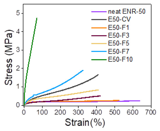 Stress–strain curves of ENR-50 compounded with various concentrations of FeCl3 at 1, 3, 5, 7 and 10 mmol, and the conventional sulfur vulcanization (i.e., E50-CV).