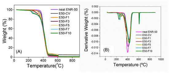 TGA (A) and DTG thermograms (B) of neat ENR-50 and ENR-50 compounded with various concentrations of FeCl3 at 1, 3, 5, 7 and 10 mmol the conventional sulfur vulcanization system (i.e., E50-CV).