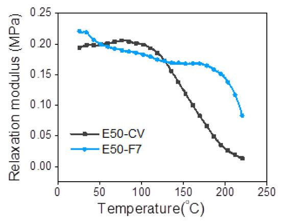 Figure 8 shows the relaxation modulus as a function of temperature of ENR compounded with 7 mmol of FeCl3 (E50-F7) and the conventional sulfur vulcanizate (E50-CV). It can be seen that the E50-F7 shows higher initial modulus than the E50-CV. This might be due to the higher level of crosslink structures. This can be corelated with the data of delta torque (Table 3), crosslinking density (Table 5) and the 100% modulus (Table 4). In Figure 8, it is also seen that that the initial relaxation modulus of E50-F7 is marginally increased, but E50-CV is remarkably increased with increasing temperature in the initial region. This might be contributed to the entropy effect, which typically happens in the rubber vulcanizates [25]. Another part of the modulus curves in the temperature ranges from 30 to 90 °C indicated the deterioration of the physically bound rubber molecules. Furthermore, the thermal degradation of sulfidic crosslinks and rubber chains are observed in the temperature ranges between 90–160 °C and 160–220 °C, respectively [25]. In Figure 8, it is clear that the E50-F7 has a higher entropy effect than the sulfur crosslinked sample, E50-EV. Additionally, the relaxation modulus of E50-CV showed rapidly decreasing to nearly zero in the temperature ranges 80–220 °C. This is attributed to lower thermal resistance of the E50-CV than E50-F7. This result correlates to lower degradation temperature (Td) of E50-CV than E50-F7 in Table 6.