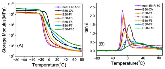 Figure 9 shows the storage modulus (E′) and the loss tangent (tan δ) as a function of temperature of the neat ENR-50 and ENR-50 compounded with various concentrations of FeCl3 and with the conventional sulfur vulcanization (i.e., E50-CV). In Figure 9A, it is clearly seen that the storage moduli in the glassy regions of E50-F7 and E50-F10 are higher than the E50-CV and other types of materials investigated. This might be due to formation of the stronger rubber networks that contain high amount of -O-Fe-O- linkages in the E50-F7 and E50-F10 vulcanizates. In the ENR-50 with lower FeCl3 concentration than 7 mmol, it is clear that lower and weaker molecular networks of ENR are formed. This might be due to the lower extent of crosslinking reactions and hence lower new formed -O-Fe-O- coordination linkages. In Figure 9A, it is seen that increasing temperature approaches the glass transition zone where the glass transition temperature (Tg) of various materials is seen, as the tan δ peaks in Figure 9B. It is clear that increasing concentration of FeCl3 in ENR-50 compounds caused higher glass transition temperature (tg). This may be associated with the increase in the crosslinking densities (Table 5) with more restriction in the rubber chain mobility. It is also clear that the ENR compounds with FeCl3 indicate only a single glass transition temperature (tg), which is seen from the single tan δ peak in Figure 9B. In Figure 9B, it is clearly seen that the ENR-FeCl3 compounds with FeCl3 greater than 3 mmol had lower tan δ peak height. This is attributed to lower level of chain mobility of the materials with higher crosslinking density and hence higher glass transition temperature (tg). In the rubbery region, E50-F7 and E50-F10 showed higher storage moduli than the E50-CV and other types of materials (Figure 9A). This is due to the higher crosslinking density based on strong reactions between FeCl3 and the epoxide groups of the ENR molecules.
