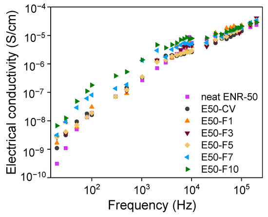 Figure 10 shows electrical conductivities of ENR compounds as a function of frequencies. It seen that the neat ENR and E50-CV show lower electrical conductivity.