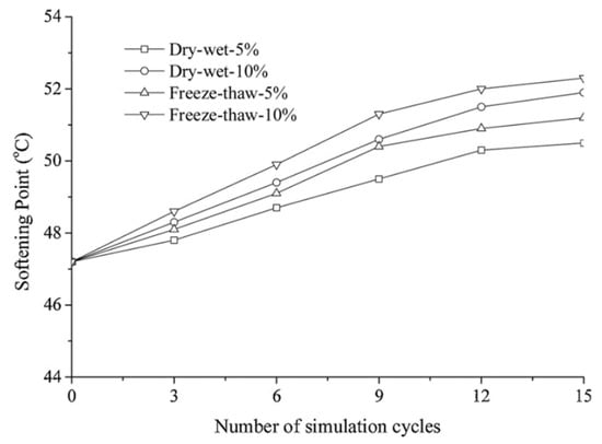 Zhou et al., revealed a decrease in the ductility of asphalt samples from 9.2% to 27.6% with an increase in the concentration of NaCl solution to 24% at a temperature of 10 °C. This is due to the formation of large crystals by Cl- ions, which block the bond between the molecules of the asphalt, as well as an increase in the proportion of asphaltenes and resins in its composition, with a subsequent decrease in proportion of light components [,]. As a result, NaCl addition causes a significant performance change, aggravating a faster deterioration of the pavement.