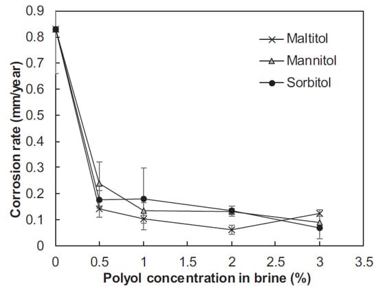 For a greater de-icing effect with less environmental impact, the addition of various organic substances is also proposed. Sajid et al. [] have added polyols (maltitol, glucite and mannitol), obtained from corn, a bio-waste product, by catalytic hydrogenation, to a 23.3% NaCl saline solution in order to improve the quality of the anti-icing salt. These corn-derived polyols were added as inhibitors for the corrosion reduction incorporating environmental friendliness and low cost, and the results of the surface analysis of the obtained materials demonstrated the presence of a protective oxide layer on the steel samples. Thus, even with a glucite content of 0.5 wt.% in the solution, there was a decrease in the average corrosion rate by 79%—from 0.83 to 0.18 mm per year (Figure 2). These polyhydric alcohols contain so-called heteroatoms, which are corrosion inhibitors and active sites for adsorption on metal surfaces [].