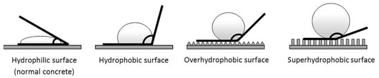 - Han, B.; Zhang, L.; Ou, J. Hydrophobic/Superhydrophobic Concrete. In Smart and Multifunctional Concrete Toward Sustainable Infrastructures; Springer: Singapore, 2017; pp. 339–357. ISBN 978-981-10-4348-2. [Google Scholar]