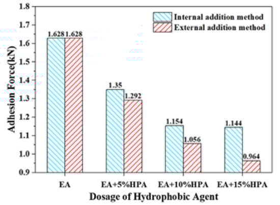 Han et al. demonstrated that the synthesized hydrophobic agent (polytetrafluoroethylene powder) in emulsified asphalt reduces adhesion between the surface and the formed ice, not only depending on the amount of polytetrafluoroethylene in the material, but also on the method of its addition to the mixture. The adhesion force after 8-h freezing at a temperature of −10 °C with external addition of the agent decreased by about 40%, while for the method of internal addition it increased by 30%, resulting in weaker hydrophobicity (Figure 4). In general, ice layers on all samples of hydrophobic emulsified asphalt were fragile and layered. Water absorbed by conventional asphalt clogs the smallest holes in the porous structure. Based on this phenomenon, according to the authors, the formed ice cover is more homogeneous and uniform compared to the hydrophobic coating, where individual water droplets tend to aggregate on the surface and the ice is not only distributed locally, but also easily displaced under load [].