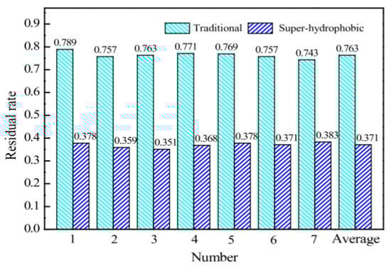 Gao et al. studied the main properties of a superhydrophobic asphalt pavement consisting of fluorosilane and nanoparticles of silicon dioxide (SiO2). After artificial simulation of frosty conditions (1 h of freezing at a temperature of −10 °C and a humidity of 85%), the superhydrophobic asphalt sample remained practically dry (Figure 5), as the water droplets practically bounced off, “springing” on the surface. This is due to the point contact between a drop of water and the presence of papillary-hierarchical micro- and nanostructures of the coating, which creates surface tension. Another explanation for this phenomenon can be a slowdown in the exchange of heat between the drop and the surface due to the air layer that appears on the surface of micro- and nanostructures. Hail modeling (the formation of artificial ice with a thickness of 8 mm on samples upon freezing at a temperature of 10 °C for 2 h) also showed that the superhydrophobic coating significantly slows down the icing process during the secondary ice formation. The residual ice formation rate on this material turned out to be much lower compared to the corresponding indicator of the uncoated sample (Figure 6), which can significantly increase the road capacity [].