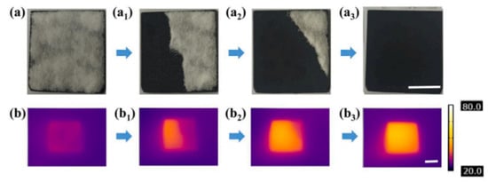 (a–a3) Self-cleaning test of superhydrophobic photothermal coating; (b–b3) thermograms of surfaces corresponding to (a–a3) after one irradiation process. Reprinted with permission from [].