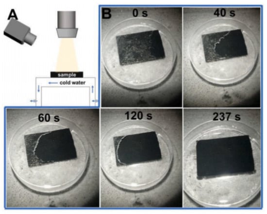 (A) Scheme of a photothermal ice removal device; (B) the process of removing ice with a thickness of about 1 mm after one irradiation (petri dish diameter is 3.2 cm). Reprinted with permission from [].