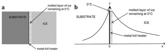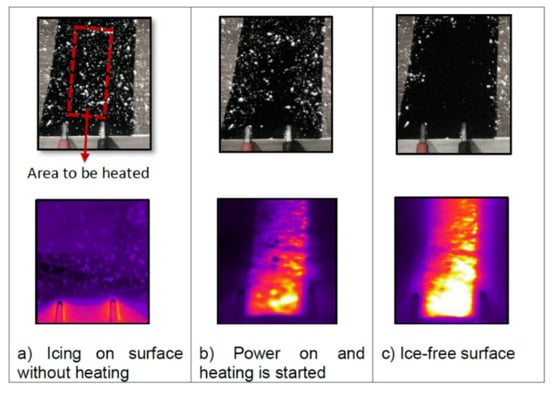 To implement this de-icing technology, a simple process diagram has been proposed, according to which a heating material is applied to the substrate surface in the form of a thin film (Figure 10a). When the heating material is turned on, the temperature at the interface between the substrate and ice rises, thereby contributing to the melting of ice (Figure 10b) [].
