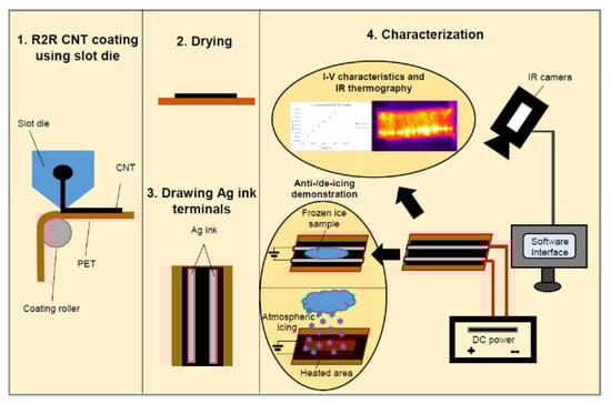 - Rashid, T.; Liang, H.-L.; Taimur, M.; Chiodarelli, N.; Khawaja, H.A.; Edvardsen, K.; de Volder, M. Roll to Roll Coating of Carbon Nanotube Films for Electro Thermal Heating. Cold Reg. Sci. Technol. 2021, 182, 103–210. [Google Scholar] [CrossRef]