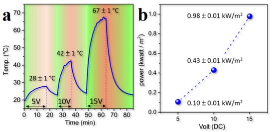 (a) Dependence of the temperature value on the applied potential and (b) the thermal power density of the composite (kW/m2) as a function of the applied external potential for 0.10 wt.% FLG/PMMA composite. Reprinted with permission from [].