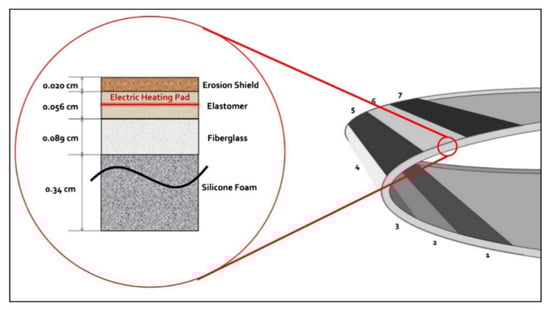 In order to avoid icing, there are used systems, which, according to the principle of operation, can be divided into categories: chemical, mechanical and thermal. Among them, the most promising are the electrothermal systems (Figure 15) []. Their efficiency is based on the integration of several heating coatings into the aircraft skin, which can be activated simultaneously for both anti-icing and ice removal from the surface.