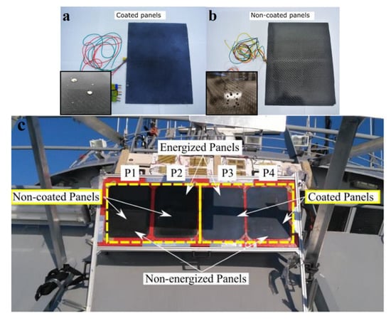 To demonstrate the effectiveness of the developed panels, the field tests were carried out onboard the patrol vessel in the Norwegian Sea (Figure 16c). Anti-icing panels with/without hydrophobic coating were compared in the harsh conditions of sea spray, wind and low temperatures (average −6 °C to −20 °C). As a result, it was demonstrated that the additional application of a hydrophobic coating to electrical heating reduces the amount of energy consumed by about 50%, depending on the operating mode.