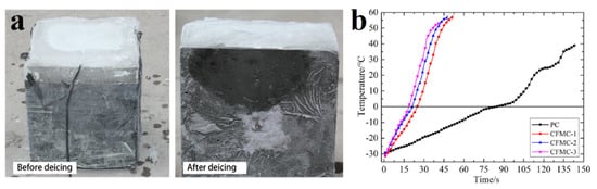 In addition, the results of tests for de-icing with microwaves demonstrate that CFMC-3 has the fastest heating rate of 1680 °C/s, which is 4.46 times higher than that of PC (Figure 18b). Even the presence of only 1‰ of carbon fiber in the structure of a concrete matrix can increase its heating rate up to 3.42 times.