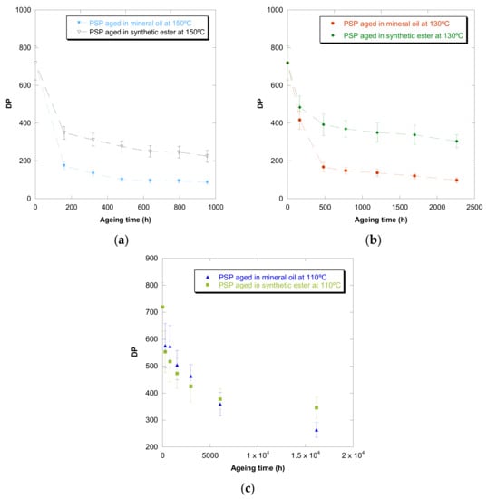 Evolution of the DP as a function of temperature for cellulose-board PSP 3055 aged in mineral oil and in synthetic ester at 150 °C (a), 130 °C (b), and 110 °C (c).