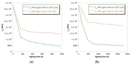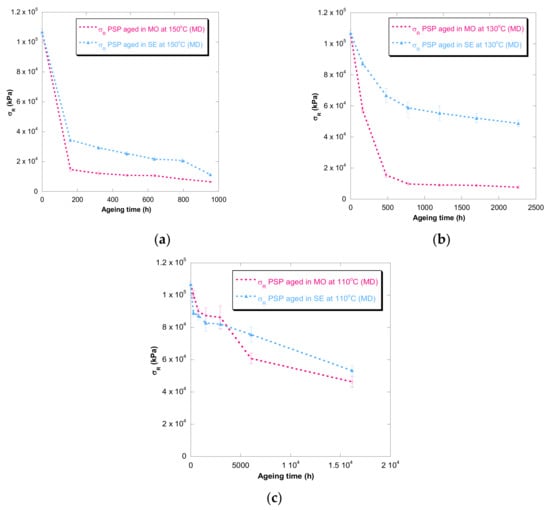 Evolution of the σR in MD as a function of temperature for cellulose-board PSP 3055 aged in mineral oil and in synthetic ester at 150 °C (a), 130 °C (b), and 110 °C (c).