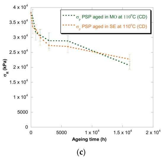The representation of ln(σR/σR0), ln (εcm/εcm0), and ln (DP/DP0) against time allowed us to obtain the values of the coefficient of aging of this model [27]. Figure 10 displays the curves based on tensile strength. The curves based on strain and DP were also done.