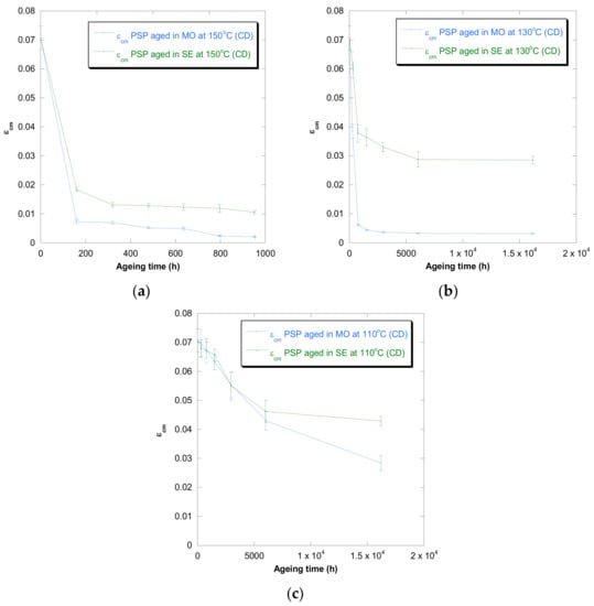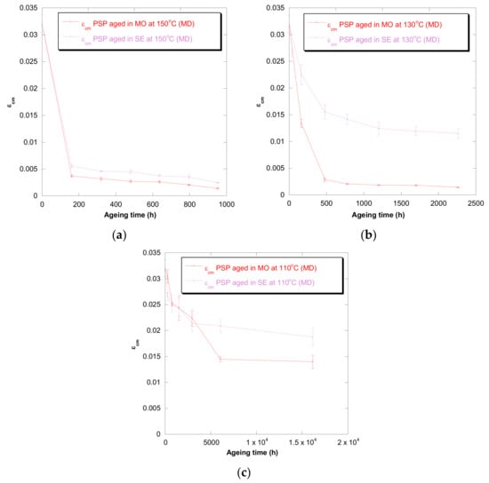 Evolution of the εcm in MD as a function of temperature for cellulose-board PSP 3055 aged in mineral oil and in synthetic ester at 150 °C (a), 130 °C (b), and 110 °C (c).