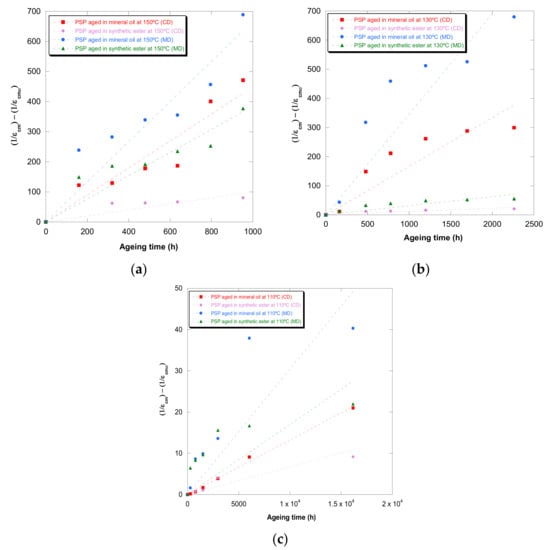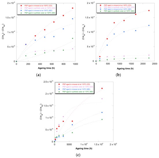 Evolution of the (1/εcm − 1/εcm0) in MD and CD as a function of temperature for pressboard PSP 3055 aged in mineral oil and in synthetic ester at 150 °C (a), 130 °C (b), and 110 °C (c) and Ekenstam’s function.