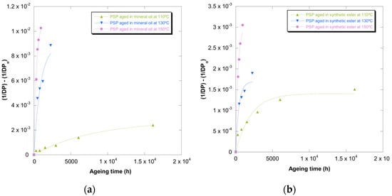 Evolution of the (1/DP -1/DP0) as a function of temperature for pressboard PSP 3055 aged at 150 °C, 130 °C, and 110 °C, and Zervos’ function, in mineral oil (a) and in synthetic ester (b).