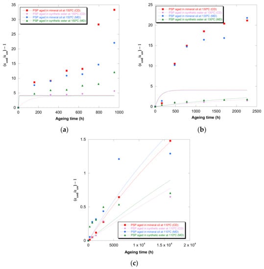 Evolution of the (εcm0/εcm) − 1 in MD and CD as a function of temperature for pressboard PSP 3055 aged in mineral oil and in synthetic ester at 150 °C (a), 130 °C (b), and 110 °C (c) and Calvini’s function.