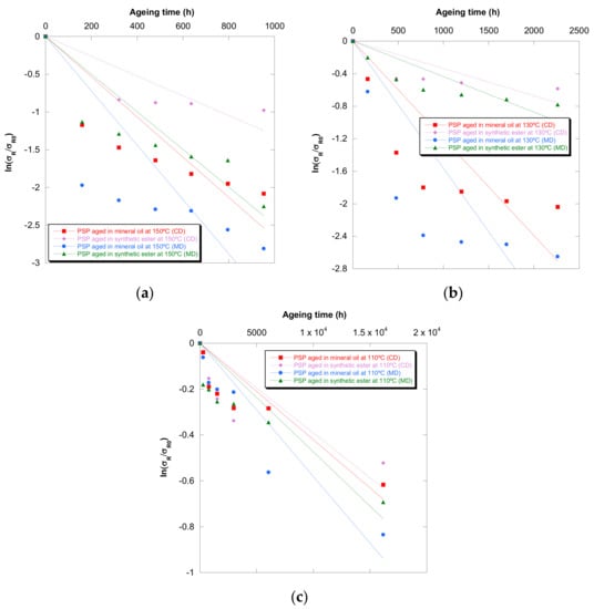 Evolution of the ln (σR/σR0) in MD and CD as a function of temperature for pressboard PSP 3055 aged in mineral oil and in synthetic ester at 150 °C (a), 130 °C (b), and 110 °C (c) and Weidmann’s function.