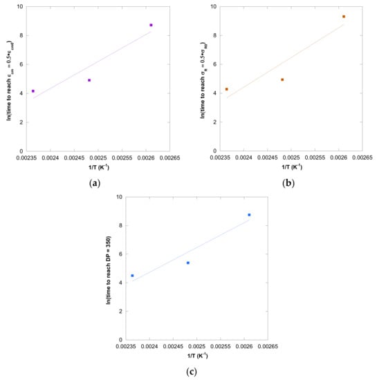 The constants of this mathematical approach were calculated using the representation of ln (time required to reach the end-of-life criteria) versus inverse temperature (1/T), resulting in a linear curve, as can be seen in the Figure 11. To guarantee that the end-of-life criteria was reached for all the conditions studied in this article, the following aging stages were established as points of comparison: DP = 350, σR = 0.50 ∗ σR0, and εcm = 0.50 ∗ εcm0.