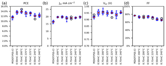 Box plots of the photovoltaic parameters for solar cells, (a) PCE, (b) JSC, (c) Voc, and (d) FF. For solar cells containing PEDOT-Al, only the variations are displayed on the labels. The red squares represent the mean and the orange lines the median (10 devices each variation).