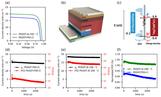 (a) JV curves of the best performing cells with PEDOT:PSS-Cl and PEDOT-Al 0.50 mC 200 °C. (b) Structure of the inverted perovskite solar cells containing the PEDOT-Al bilayer, and (c) schematic diagram of energy levels, including the DOS of PEDOT:PSS-Cl with its mid-gap states, and the charge density of electrons and holes for perovskite. (d,e) Stabilized current density and steady-state PCE under 1 sun illumination for (d) the reference cell with an initial JV efficiency (JV PCE) of 12.3%, and (e) the cell with PEDOT-Al 0.50 mC 200 °C with a 13.4% JV PCE. (f) Normalized steady-state PCE with respect to the JV PCE of each cell.