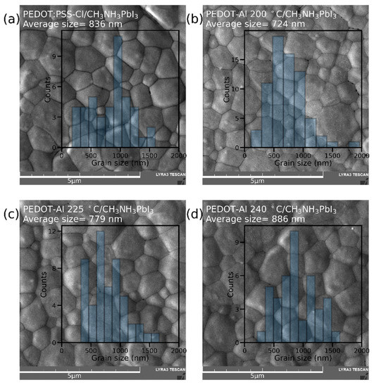 The effect of PEDOT-Al 0.50 mC annealing temperature on perovskite film morphology was studied through top-view SEM images (Figure 3). Grains up to ~1.5 μm were found in all variations, possibly due to the merged annealing method that produces large-grain-size perovskite films [27]. Furthermore, when analyzing the average grain size, no trend was detected to explain the higher efficiencies with PEDOT-Al. The average grain size for annealing at 200 °C is even smaller than that of the reference device. This shows that the reason for the efficiency increase is not related to the perovskite grain size [39]. It can also be observed that the grain size distribution is above the perovskite layer thickness (400 nm) for all studied devices (Figure S3). Variations within these ranges do not significantly increase the grain boundaries in the vertical direction and do not induce larger recombination sites.