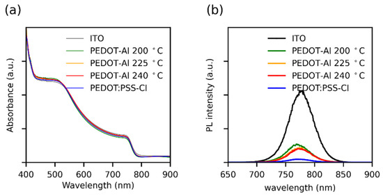 Considering that the perovskite layer had the same thickness in all devices, it was confirmed by UV-visible absorption spectroscopy that perovskite films deposited on the different substrates show no differences in light absorption (Figure 4a). Stationary photoluminescence (PL) showed that all HTMs induce strong PL quenching compared to perovskite deposited on ITO (Figure 4b), and PEDOT:PSS-Cl showed the highest PL quenching. Although this seems to go against the higher JSC found for PEDOT-Al bilayers, it has been demonstrated that, when the most intense PL corresponds to the most efficient device, it is considered indicative that the HTM modification induces changes in recombination phenomena from a non-radiative to a radiative process [43,44]. In the PEDOT-Al bilayers, Al2O3 could produce this effect by passivating the non-coordinated Pb2+ ions on the perovskite surface, thus reducing the trap states responsible for non-radiative recombination, which correlates with the Voc enhancement [18,43,44,45].