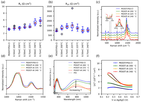 To confirm the decrease in polaronic states, a Mott–Schottky analysis was performed to determine the charge carrier density in HTMs. In conducting polymers, this is challenging as the doping level may change due to the potentials applied during the measurements. To extract information that resembles the original state of the HTMs, a low polarization electrochemical window was chosen. Figure 5f shows the results: in this plot, the slope of the linear section is inversely proportional to the charge carrier density (Table S3) [70,71]. As expected, the PEDOT:PSS-Cl and PEDOT-Al 0.50 mC 200 °C films have the highest charge carrier density. Moreover, it can be observed that the carrier density decreases as the annealing temperature increases. This reduction of charge carriers (polarons) in this polymer has been related to the formation of bonds between the chlorides (Cl−) and positive charges on the polymer chains, and to the recombination with radicals generated during degradation [56,59,72]. Since reverse and forward sweeps showed similar results, it follows that the effect of doping was significantly reduced under these experimental conditions. Overall, Raman, UV-Vis, and Mott–Schottky characterizations reveal that the mechanism affecting the conductivity of PEDOT is accentuated at 240 °C and contributes to the noticeable increase in Rs, resulting in low FF and limiting the PCE of the PEDOT-Al devices.