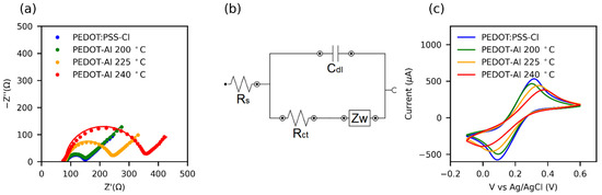 The effect of thermal degradation on the HTMs was also investigated through electrochemical impedance (EIS) and cyclic voltammetry (Figure 6a–c). Table S4 presents the charge transfer resistance (Rct) values obtained by fitting the results to the equivalent circuit in Figure 6b. It was found that, for the annealing temperature of 200 °C, PEDOT-Al had almost the same Rct as pristine PEDOT:PSS-Cl, and increasing the annealing temperature also increased the Rct. In conducting polymers, the Rct is closely related to the microstructure. Thus, the symmetry and reversibility of the redox reaction depend on the overlap of the density of states (DOS) of the polymer and the redox probe, whereby a highly organized microstructure results in a DOS of the polymer that facilitates reversible charge transfer [73].