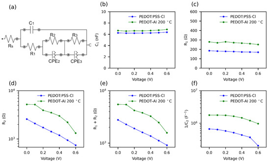Effect of PEDOT-Al 0.50 mC 200 °C on the parameters of impedance spectra at various applied voltages, under 1 sun illumination. (a) Equivalent circuit for fitting impedance spectra. R: resistance; C: capacitance; and CPE: constant phase elements. (b) C1, (c) R1, (d) R2, (e) R1 + R2, and (f) 1/C2; C2 was extracted from CPE2.