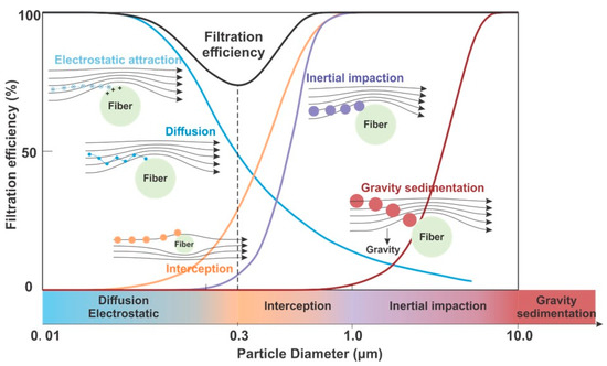 | Particle size | With decreasing particle size, the filtration efficiency starts to decrease before increasing again (Figure 3) | [93,94] |