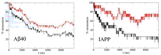Percentage of monomers in simulations of the highly aggregating peptides A40 at 30 M concentration (left) and IAPP at 100 M (right) with the original PACSAB force field parametrization (black line) and with the new PACSAB force field (red line).