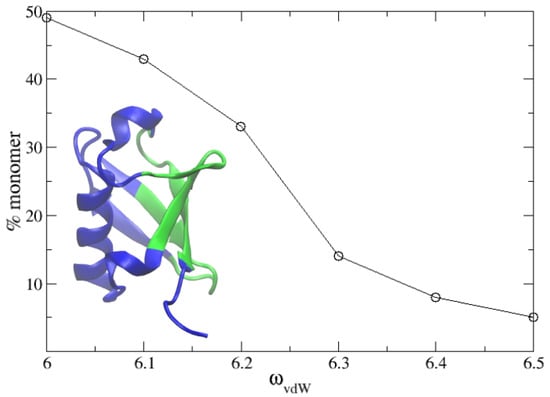In a recent work, we studied the dimerization and molecular recognition of ubiquitin using explicit solvent molecular dynamics simulations []. Here, we wanted to test our PACSAB model in this system at the concentration of 5 mM used in the experiments []. We refined the parametrization of the new PACSAB force field [] in order to reproduce the 50% percentage of monomer in a solution of ubiquitin at a 5 mM concentration. We show in Figure 4 the dependence of the percentage of monomers on the force field parameter . The refinement involved eight 2 s long simulations for each value of . In the figure, we show the experimentally known [] binding interface of ubiquitin. This optimization of the force field just produced a slight increase of 5% in with respect to its initial value.