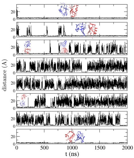 Minimum distance between two ubiquitin molecules in molecular dynamics simulations of a solution of ubiquitin at a concentration of 5 mM with the PACSAB model in the 8 trajectories produced. The most stable bound configurations found during the simulations are shown.