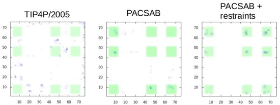 We show in Figure 5 the eight trajectories obtained with this force field parametrization, showing the most stable bound configurations, and in Figure 6 the intermolecular contact map sampled along these trajectories. It is known from NMR-based experimental studies by Liu et al. [] that ubiquitin forms transient low-affinity noncovalent dimers defined by a large interface where many relative orientations are possible []. The binding interface is the beta-sheet surface of ubiquitin, formed by the residues 4–12, 42–51 and 62–71. We have highlighted in the contact maps (Figure 6) the regions defined by these sequence regions. In our previous work we found that TIP4P/2005 [] was the water model that produced the best results in explicit solvent MD simulations. TIP4P/2005 reproduced correctly the high diversity of relative positions of the two bound ubiquitin molecules, but failed to predict the native binding interface, as observed in Figure 6. An analysis of the contact maps reveals that the PACSAB model better predicts the native binding interface than explicit solvent simulations with TIP4P/2005, although many contacts with residues outside the experimental binding interface are still formed.