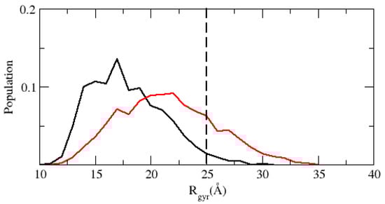 Distribution of radii of gyration in the simulations of the disordered protein ACTR in explicit solvent MD simulations with TIP4P/2005 water (black line) and with the PACSAB model (red line), using the same parametrization used in the simulations of ubiquitin dimerization. The vertical dashed line marks the experimental estimation of the radius of gyration of ACTR.